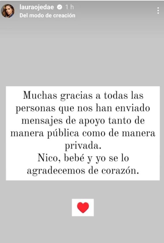 “Muchas gracias a todas las personas que nos han enviado mensajes de apoyo tanto de manera pública como de manera privada. Nico, bebé y yo se los agradecemos de corazón”, dijo la mujer.