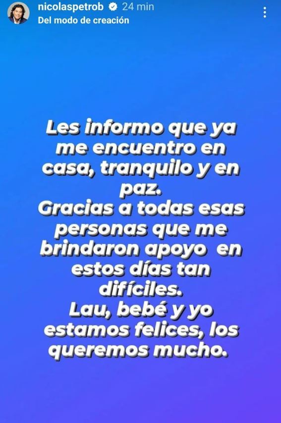 “Les informo que ya me encuentro en casa, tranquilo y en paz. Gracias a todas esas personas que me brindaron apoyo en estos días tan difíciles. Lau, bebé y yo estamos felices, los queremos mucho”, escribió Nicolás en una historia de Instagram.