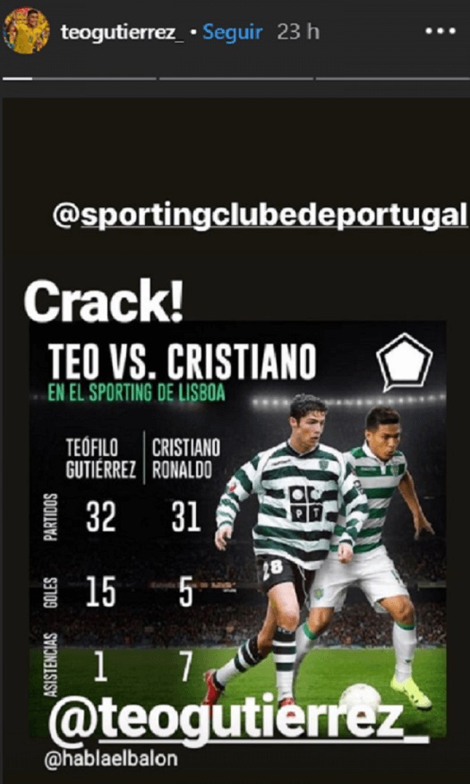La imagen hecha por un blog deportivo fue compartida en las historias de Instagram por el jugador colombiano y aunque celebró las cifras la diferencia es que Cristiano apenas empezaba su carrera en el Sporting con 17 años entre 2002 y 2003, mientras que Teófilo llegó a los 30 años, entre 2015 y 2016, después de haber jugado en River Plate.