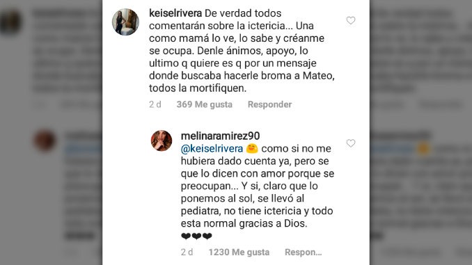 “Tu bebé tiene ojitos amarillos, es síntoma de ictericia, ponlo al sol, pero si no mejora es mejor que el pediatra te asesore”, “el príncipe Salvador se ve con ictericia, debes pegarlo más a la ‘pucheca’ para que por medio de la orina elimine las bilirrubinas” y “tiene la esclera muy amarilla, ponlo al sol 10 minutos al día para que se le baje la ictericia”, fueron algunos de los comentarios que Melina leyó, por eso ella decidió responderlos así: “😅 como si no me hubiera dado cuenta ya, pero sé que lo dicen con amor porque se preocupan… Y sí, claro que lo ponemos al sol, se llevó al pediatra, no tiene ictericia y todo está normal gracias a Dios. ❤❤❤”.