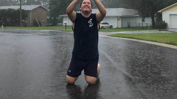 El chicho de la ciudad de Orlando (Estados Unidos) se puso de rodillas bajo la incesante lluvi, y sostuvo una gaseosa. En el pie de la fotografía que publicó escribió: “Por favor Irma, acepta esto como ofrenda”
