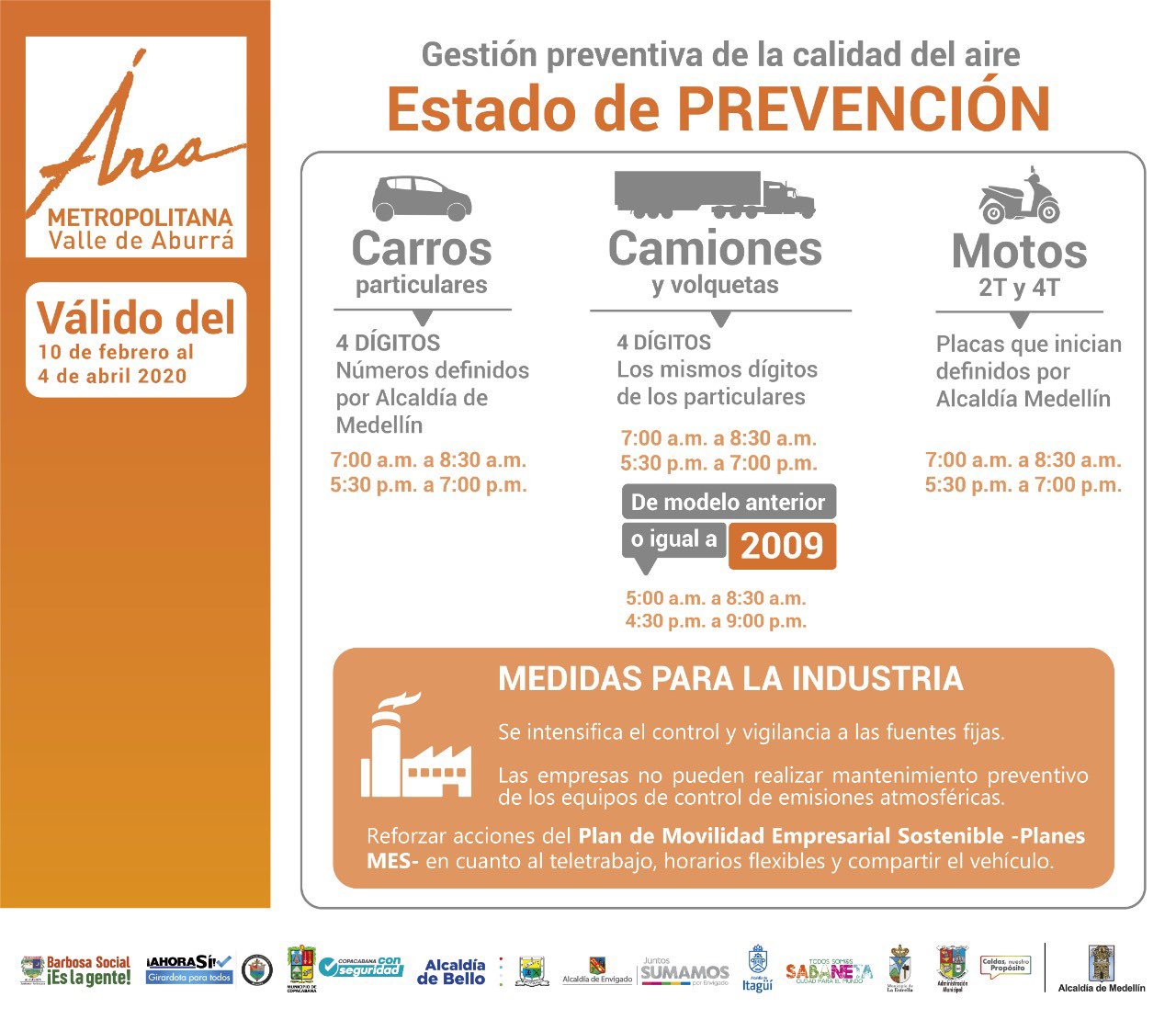 El Área Metropolitana informó mediante su director, Juan David Palacio Cardona, que desde este lunes se decreta el estado de prevención y anunció cambios en el pico y placa.