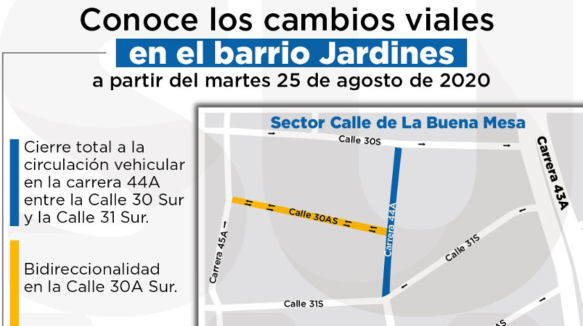 En ese contexto se declaró el cierre total a la circulación vehicular en la Carrera 44 A entre la Calle 30 Sur y Calle 31 Sur, barrio Jardines, sector de La Buena Mesa, medida establecida en la Resolución 1021 del 24 de agosto de 2020, con el fin de iniciar el proceso de peatonalización de algunas vías del sector.