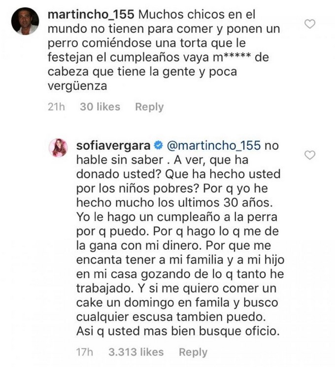 “No hable sin saber, A ver, que ha donado usted? Qué ha hecho usted por los niños pobres? Porque yo he hecho mucho estos últimos 30 años. Yo le hago un cumpleaños a la perra porque puedo. Porque hago lo que se me da la gana con mi dinero. Porque me encanta tener a mi familia y a mi hijo en mi casa gozando de lo que tanto he trabajado. Y si me quiero comer un cake un domingo, en familia y busco cualquier excusa también puedo. Así que usted más bien busque oficio”, dijo la actriz.