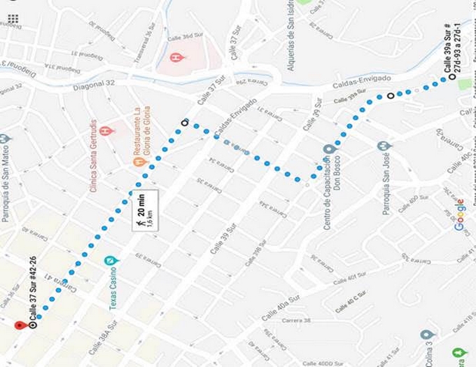 Institución Universitaria de Envigado – carrera 27B, tomando hacia la derecha para llegar a la calle 40 sur, hasta la carrera 29 A – Parroquia San José hasta llegar a la calle 39B Sur, donde se girará a la izquierda hasta la carrera 33 “La Orqueta” en sentido Sur-Norte hasta la calle 37 sur – Institución Educativa Normal Superior; allí se girará a la izquierda hasta la carrera 43 A – establecimiento de comercio Súper Drogas, para girar nuevamente a la izquierda hasta llegar a la calle 38 Sur, para tomar hacia la izquierda hasta la carrera 42, y llegar al Parque Principal Marceliano Vélez Barreneche.