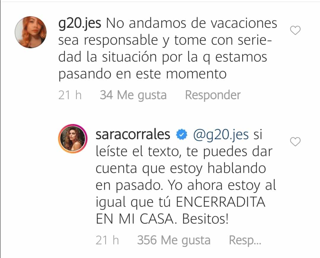 Con toda la paciencia del caso, Sara le respondió amablemente que la imagen se hizo hace ya varias semanas y que en la actualidad ella está en su casa en aislamiento voluntario junto a su madre disfrutando tiempo en familia.