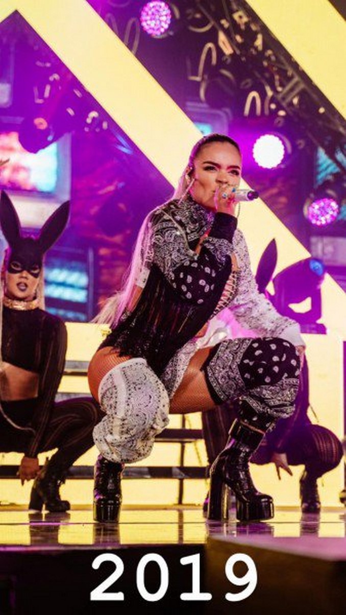 La segunda imagen es de una de sus últimas presentaciones en este 2019, se ve a la cantante con sus sensuales curvas acompañadas de un atuendo más elaborado y una presencia en la tarima más fuerte.
