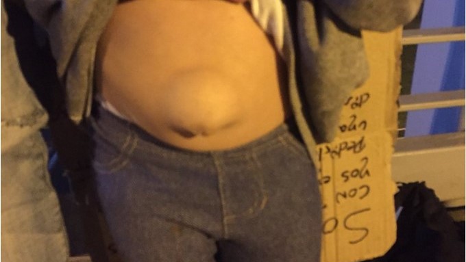 La niña quien se encuentra en compañía de su padre en un puente de la ciudad de Bogotá, donde intentan recoger diariamente 15.000 pesos colombianos pagar una habitación donde dormir, presenta una hernia de gran tamaño que le genera mucho sufrimiento.