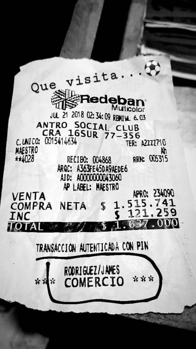 El futbolista “cafetero” no pasó desapercibido, una fotografía del “voucher” de la tarjeta de crédito con la que pagó la cuenta en el lugar, se filtró en la web, y es el monto que canceló lo que tiene sorprendidos a los internautas.