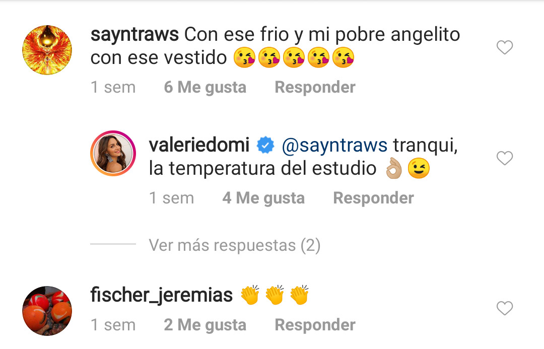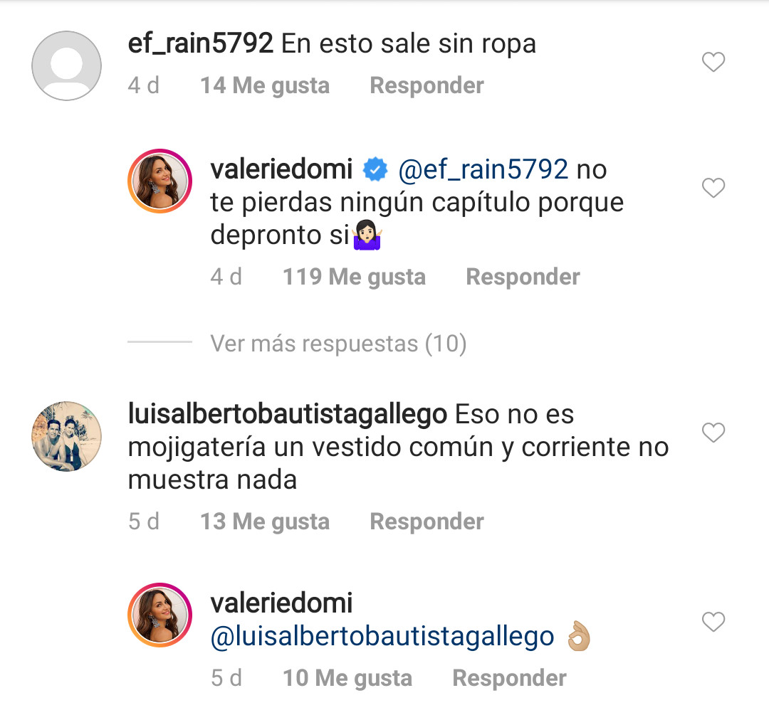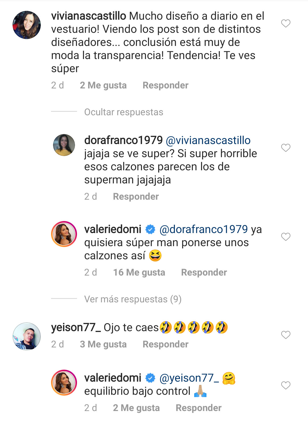 Sin embargo, no faltan los que no están de acuerdo con tanta piel a la vista y hasta se preocupan por al salud de Valerie, con críticas que a veces no se dan en el mejor tono. Aún así, la exreina y también actriz sabe muy bien cómo hacerles frente haciendo gala de su clase, elegancia y buen sentido del humor. A continuación algunas de las respuestas de Valerie en Instagram: