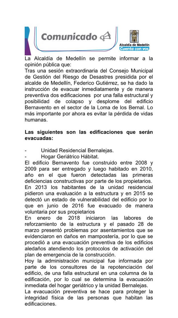 Minuto30.com .- La noche de este jueves 12 de abril, y luego de que se llevara a cabo una sesión extraordinaria del Concejo Municipal del Riesgo de Desastres, presidida por el alcalde Federico Gutiérrez, se ha dado la orden del desalojo inmediato de dos edificaciones colindantes con el Edificio Bernavento, ubicado en la Loma de los Bernal, en el suroccidente de Medellín. El mandatario de la capital antioqueña se encuentra en el lugar donde se lleva a cabo la labor de evacuación inmediata.