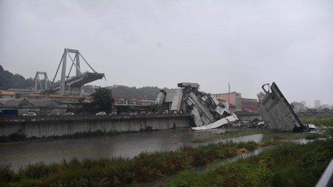 El siniestro ocurrió en el puente Morandi, de 1.182 metros de longitud y una altura de 90 metros, y del que se vino abajo un tramo de dos carriles de unos cien metros de longitud, sepultando bajo los escombros a varios vehículos.