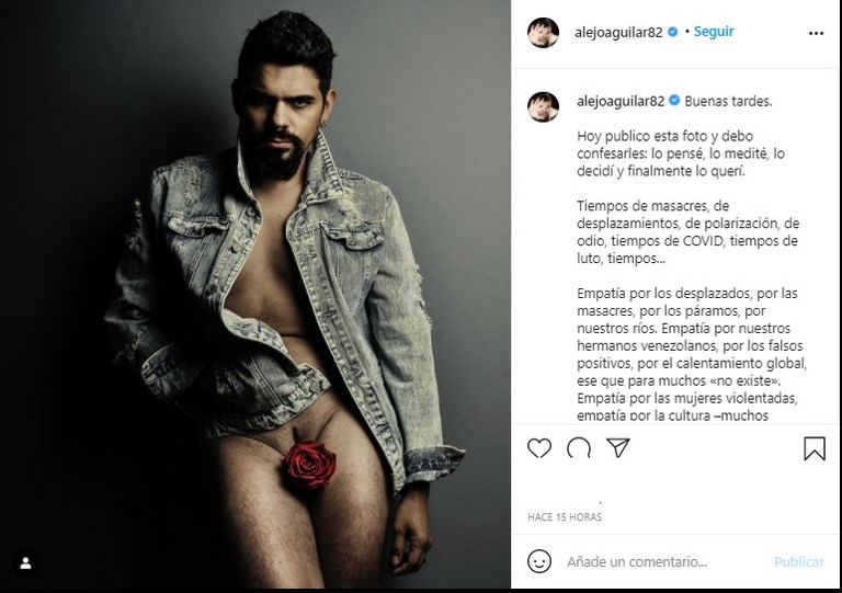 Alejandro Aguilar, esposo de la presentadora Ana Karina Soto, cubrió su entrepierna con tan solo una rosa. A través de su cuenta de Instagram el reconocido actor compartió una fotografía semidesnudo, en la que salía luciendo una chaqueta y cubriendo su parte íntima con una flor roja.