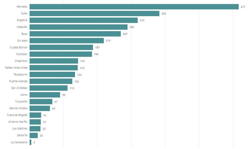 Según las cifras oficiales, la localidad con más casos es Kennedy, donde hay 617 al día de hoy, seguida por Suba con 383, Engativá con 319, Usaquén con 289 y la localidad que están al final de la lista es La Candelaria con 5 casos.