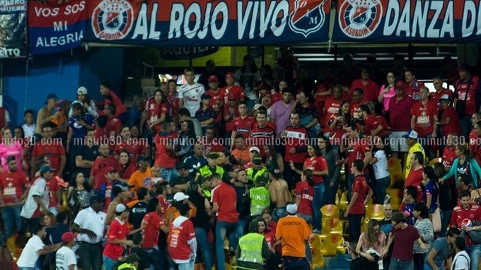 Minuto30.com .- La noche de este sábado 5 de marzo, poco antes de concluir la primera parte del partido que disputaban el Deportivo Independiente Medellín y el Deportivo Cali en el Estadio Atanasio Girardot de la capital antioqueña, se presentaron disturbios en las tribunas.