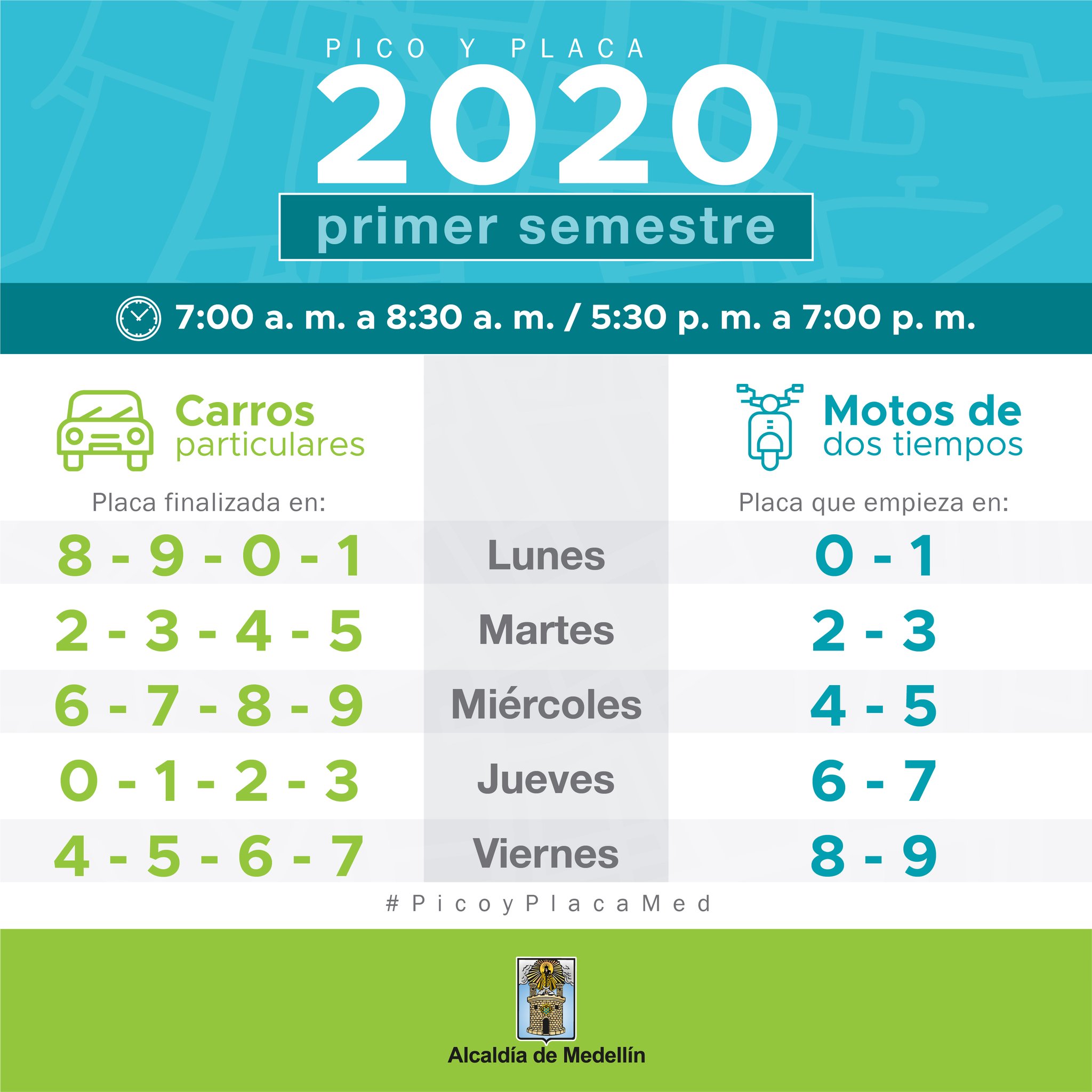 La Alcaldía de Medellín bajo la Secretaría de Movilidad, informó el día de hoy, la rotación que tendrá el pico y placa para el primer semestre del año, el cual está regido bajo el Decreto 111 de 2020.