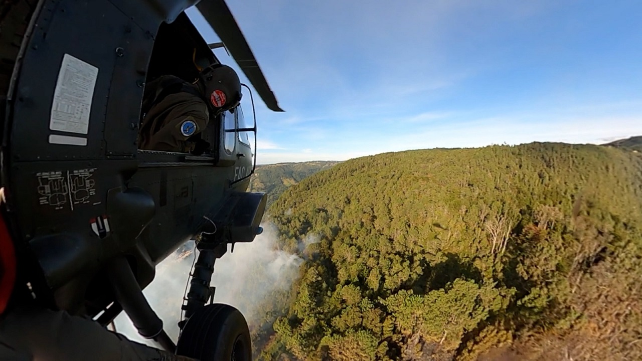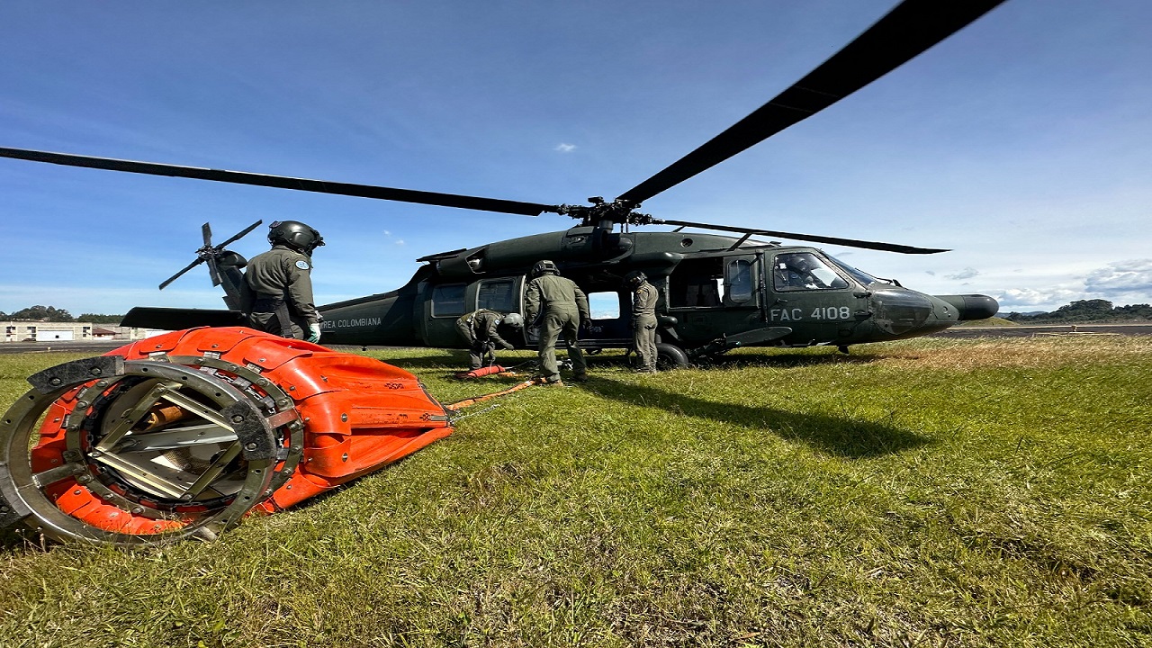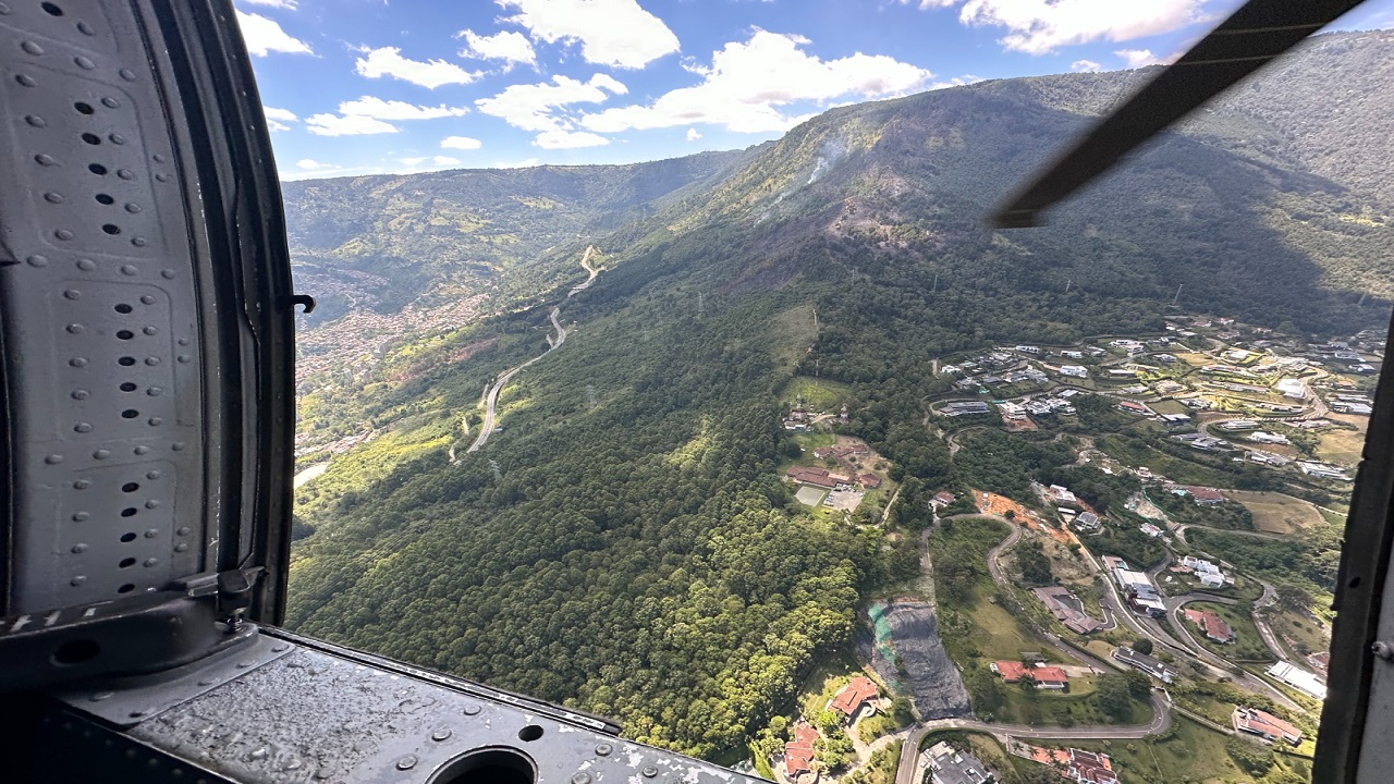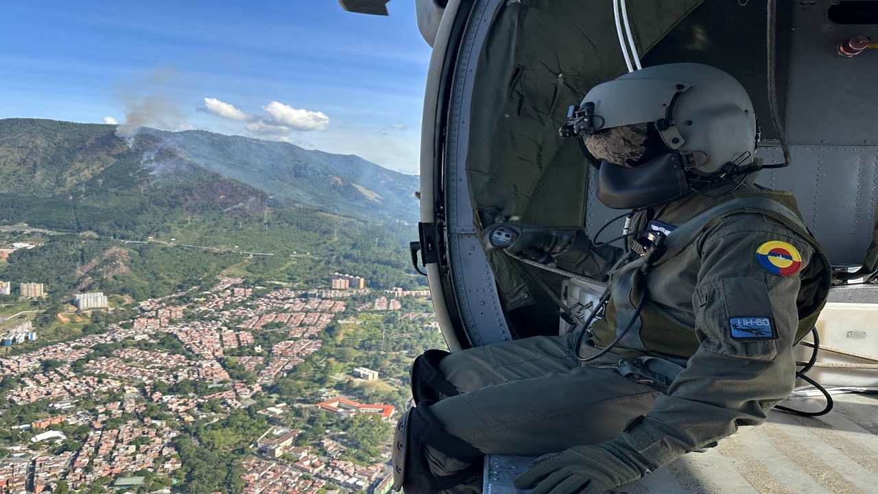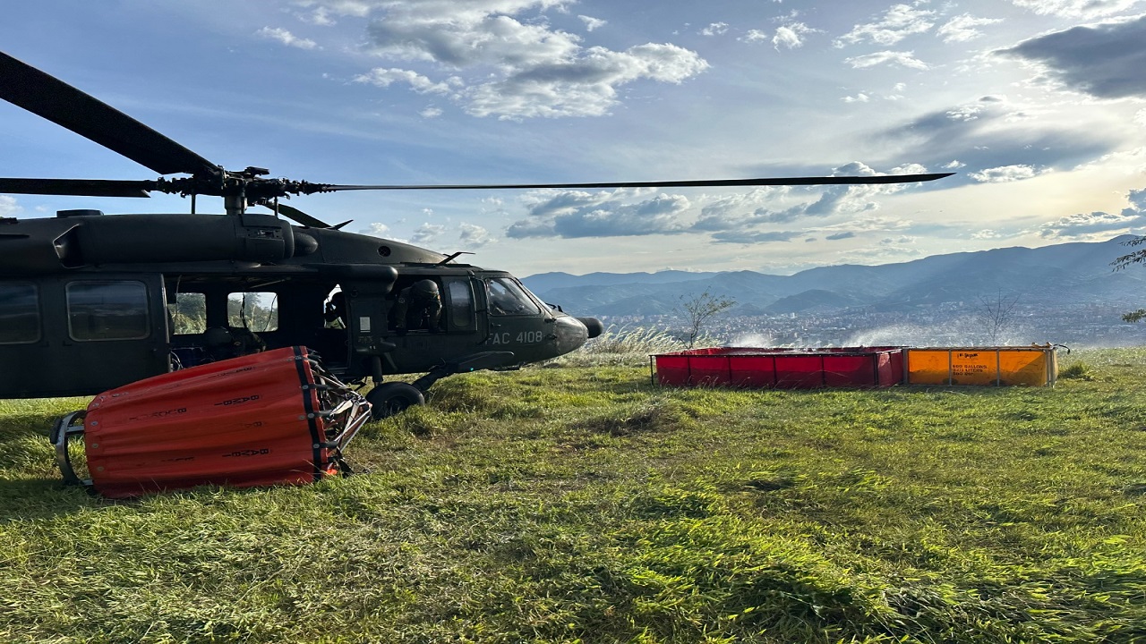La Fuerza Aeroespacial Colombiana con su helicóptero UH-60 del Comando Aéreo de Combate No.5, configurado con el sistema Bambi Bucket, realizó descargas de siete mil litros de agua mezclados con líquido retardante, sobre los focos del incendio de cobertura vegetal que afecta La Asamadora, área rural de la comuna 9 de Medellín.