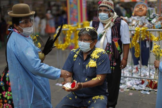 “Es para que pueda florecer nuevamente su corazón, para que pueda pagar las deudas, tener un negocio”, después de este “mal año que hemos tenido con el virus”, explicó a Efe la maestra boliviana Victoria Jalgo, mientras arrojaba a su clienta flores amarillas, símbolo de la prosperidad.
