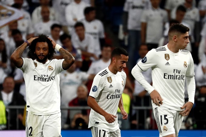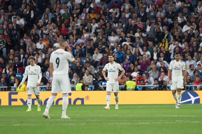 Los jugadores del Real Madrid (i-d) Modric, Benzemá, Nacho y Casemiro tras encajar gol ante el Viktoria Plzen, durante el partido de la fase de grupos de la Liga de Campeones que se disputó en el estadio Santiago Bernabéu, en Madrid. EFE