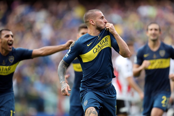 BAS114. BUENOS AIRES (ARGENTINA), 11/11/2018.- El jugador de Boca Juniors Darío Benedetto celebra después de anotar un gol hoy durante el primer partido de la final de la Copa Libertadores entre Boca Juniors y River Plate, en el estadio la Bombonera de Buenos Aires (Argentina). EFE/Raúl Martínez