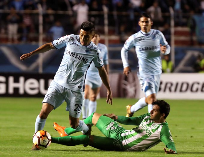 Erwin Saavedra (i) del Bolívar en acción ante Pablo Castellani (d) del Nacional hoy, jueves 5 de abril de 2018, durante un partido por la fase de grupos de la Copa Libertadores disputado entre el Bolívar boliviano y el Atlético Nacional de Colombia, en el estadio Hernando Siles de La Paz (Bolivia). EFE