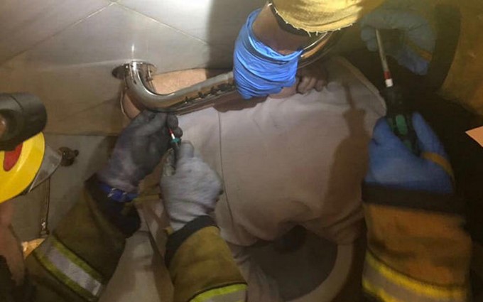 Los hombres tuvieron que destornillar el inodoro para liberarlo.