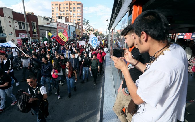 En la capital colombiana y como es ya costumbre desde que comenzaron las movilizaciones estudiantiles el pasado 11 de octubre para pedirle al Gobierno del presidente colombiano, Iván Duque, un aumento en el presupuesto para las universidades públicas, los jóvenes impidieron el normal tránsito del servicio de transporte masivo Transmilenio.