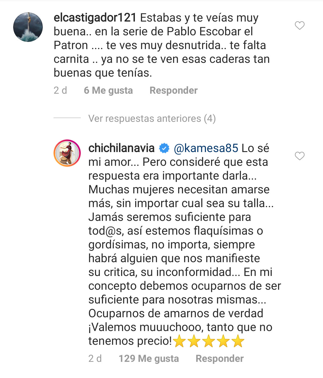 Por ello, Navia le respondió de forma decente y contundente diciéndole que ella goza de una gran salud y que se ama igual estando de talla 6, 10 o 14. También le aseguró a otra usuaria que era necesaria esta respuesta para enviarle un mensaje a todas las mujeres para que se amen tal como son.