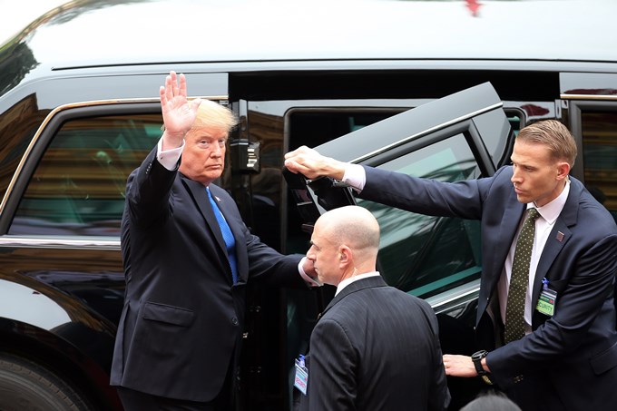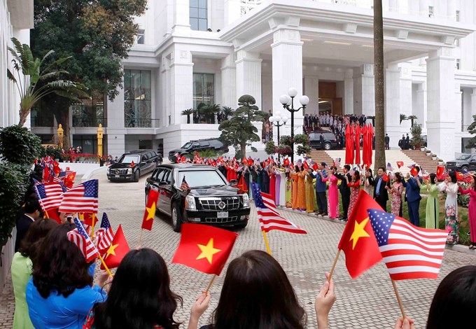 La comitiva del presidente estadounidense, Donald Trump (c), tras su reunión con el primer ministro de Vietnam, Nguyen Xuan Phuc, en Hanoi (Vietnam) antes del comienzo de la segunda Cumbre Corea del Norte-Estados Unidos, este miércoles, en Hanoi (Vietnam). EFE/ SÓLO USO EDITORIAL
