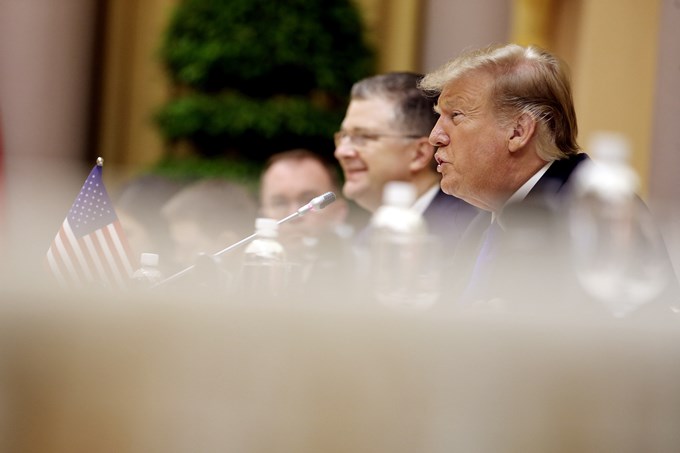 El presidente estadounidense Donald Trump en un momento de la reunión que ha mantenido hoy con su homólogo de Vietnam Nguyen Phu Trong, en un encuentro previo a la Cumbre Corea del Norte-Estados Unidos, este miércoles, en Hanoi (Vietnam). EFE