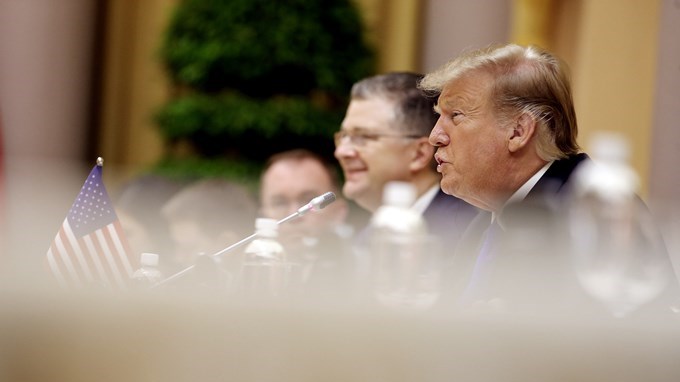 El presidente estadounidense Donald Trump en un momento de la reunión que ha mantenido hoy con su homólogo de Vietnam Nguyen Phu Trong, en un encuentro previo a la Cumbre Corea del Norte-Estados Unidos, este miércoles, en Hanoi (Vietnam). EFE