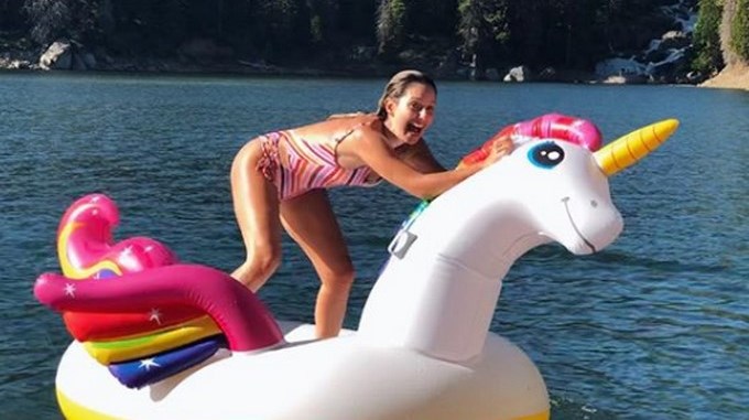 Claudia no pierde oportunidad para hacer alguna jugarreta y destornillarse de la risa, como este paseo familiar que hizo al lago Shaver en California, Estados Unidos. La presentadora de ‘Masterchef’ intentó hacerse una foto “cool” encima de un flotador en forma de unicornio y casi no lo logra, pues mantener el equilibro en el agua es difícil y más en una pose sexi que quería realizar.