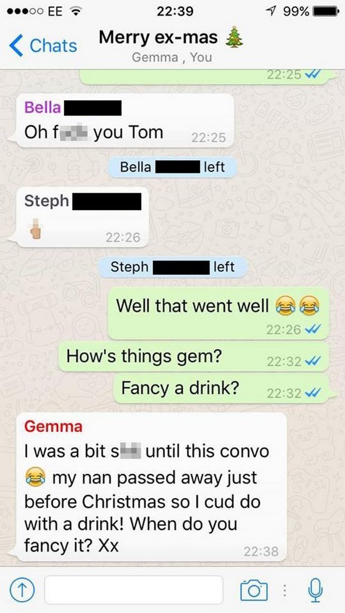Gemma, una de las chicas respondió al mensaje cuestionando si había tomado de más, luego  Bella, le envió un mensaje poco cordial.