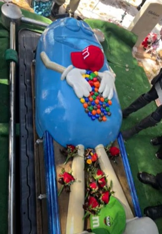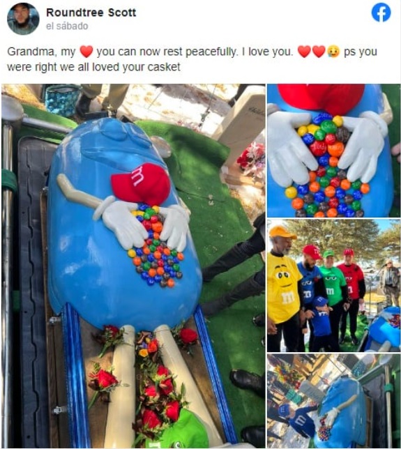 Por esto, el ataúd tenía la forma de uno de los personajes publicitarios de la marca M&M’s. Este estaba acostado con los ojos cerrados y en el centro había pequeños dulces con los nombres de los seres queridos de esta abuelita.