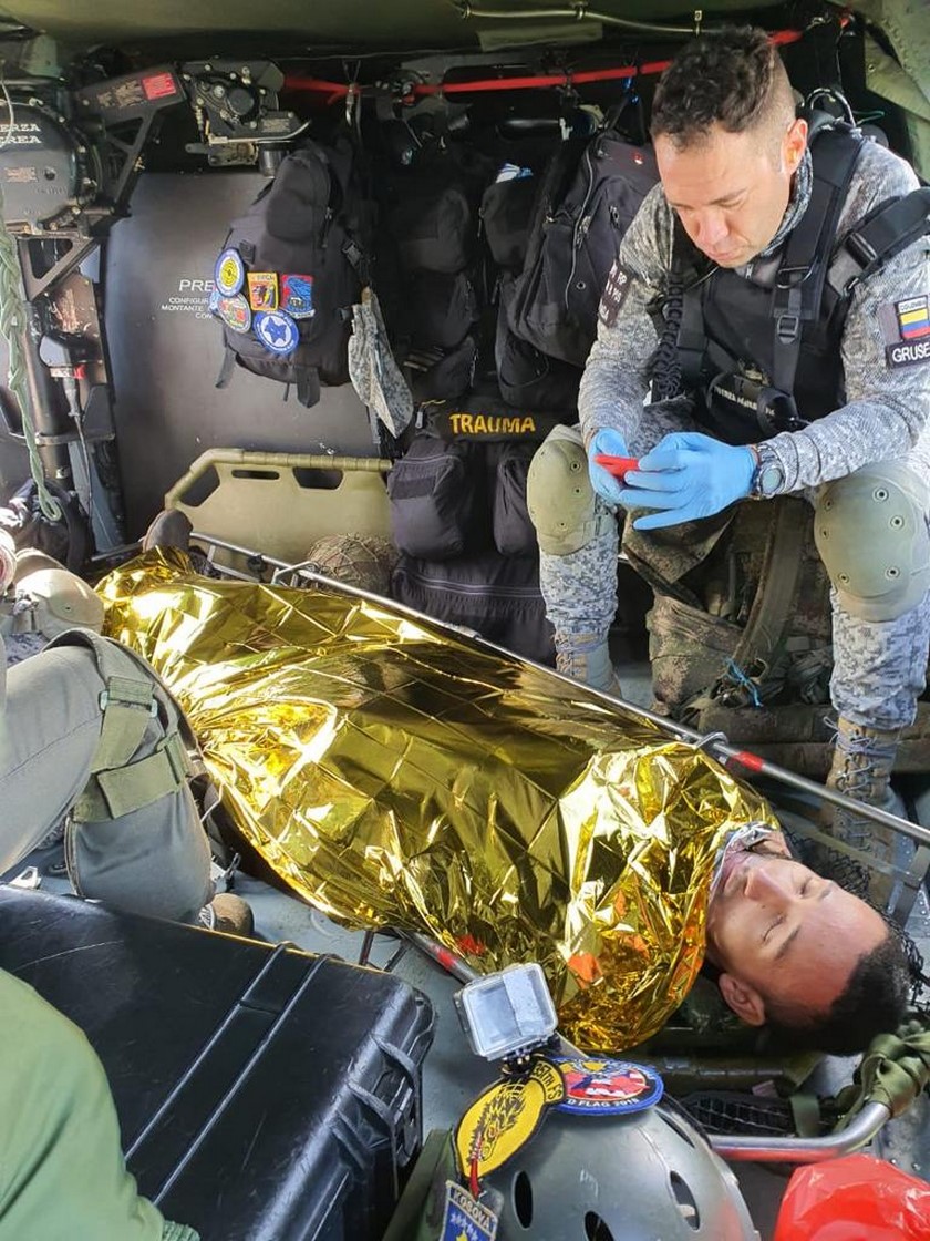 Uno de los soldados se encontraba en la espesa selva chocoana. Debido a las condiciones del terreno el helicóptero no pudo aterrizar y fue necesario hacer la extracción de uno de los soldados por medio de una grúa de rescate.
