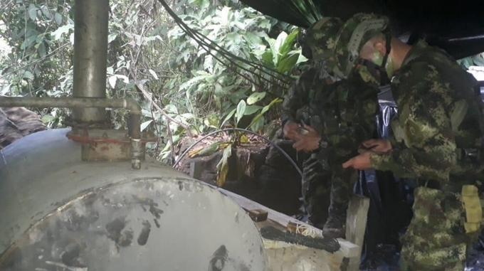 El Ejército Nacional logró desmantelar un gran complejo de producción de cocaína compuesto por tres laboratorios de procesamiento de clorhidrato de cocaína y uno para pasta de base de coca en la vereda El Diviso, en el municipio de Tibú, Norte de Santander, afectando las finanzas del ELN.