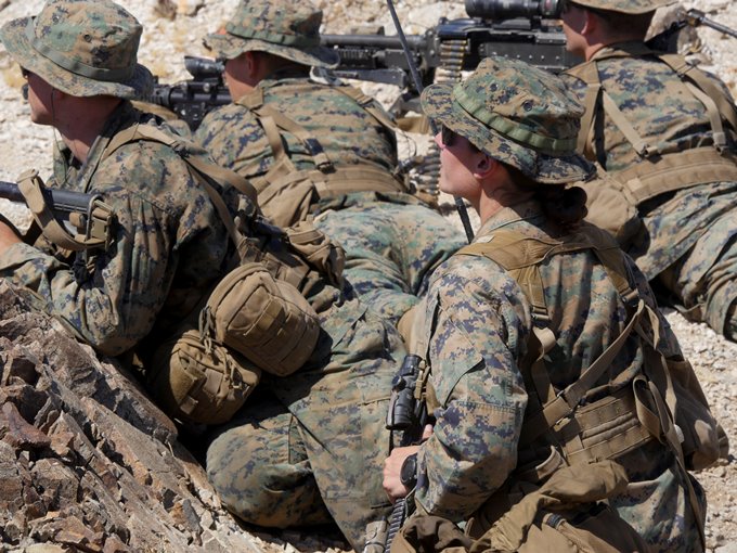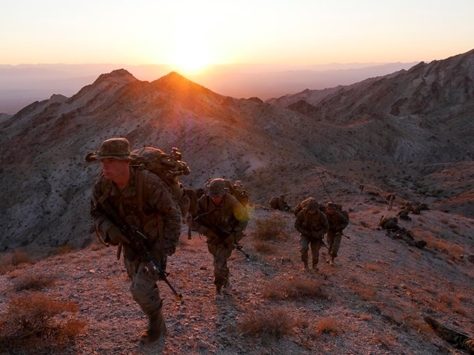 Fotografía cedida por el cuerpo de marina de los EEUU este lunes 25 de septiembre de 2017, muestra infantes de marina participando en un ejercicio durante el curso de oficial de infantería en el Centro de Combate de Tierra Aérea del Cuerpo de Infantería Twentynine Palms, California, EE.UU., el 18 de septiembre de 2017. EFE/US MARINE CORPS/SGT. GREGORY BOYD