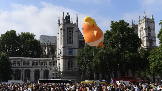 El globo gigante de un “bebé Trump” en pañales y sujetando un móvil se alzó hoy enfrente del Parlamento de Londres, como parte de las protestas por la primera visita oficial al Reino Unido del presidente estadounidense, Donald Trump.