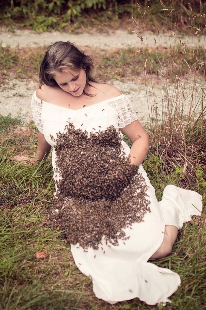 Al igual que muchas madres Emily quiso posar de una forma muy natural y feliz, rodeada de la naturaleza, pero dejó a más de uno impactado al decidir posar en medio de miles de abejas y más impresionante aún, ponerlas en su vientre.
