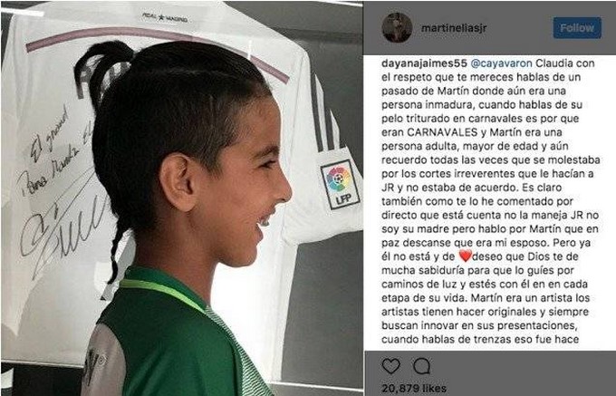 “@cayavaron, Claudia con el respeto que te mereces hablas de un pasado de Martín donde aún era una persona inmadura, cuando hablas de su pelo tinturado en carnavales es por que eran carnavales y Martín era una persona adulta, mayor de edad; y aún recuerdo todas las veces que se molestaba por los cortes irreverentes que le hacían a JR y no estaba de acuerdo”, replicó Jaimes.