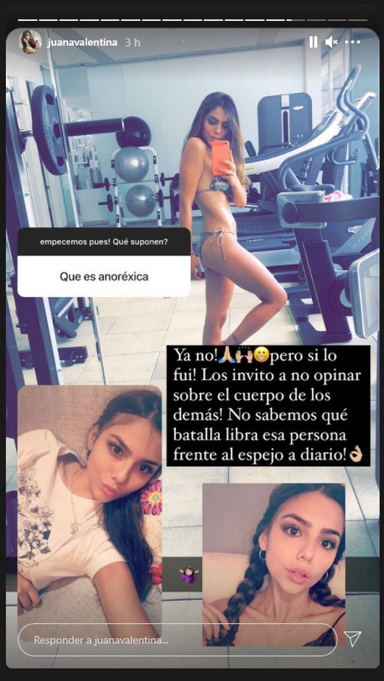 Hablando con sus seguidores por medio de la opción de preguntas, Juana Valentina fue cuestionada luego de que colocará como tema: “qué suponen”. Una los internautas le dijo: “Qué es anoréxica”, por lo que mostró varias imágenes en la que se veía extremadamente delgada en un gimnasio, acostada y con unas trenzas. Además, las acompañó con este escrito: “Ya no pero si lo fui. Los invito a no opinar sobre el cuerpo de los demás. No sabemos que batalla libra esa persona frente al espejo”.