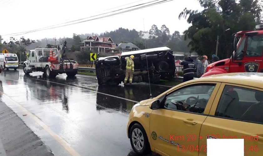 El accidente tránsito se presentó a eso de las 2:50 de la tarde, un furgón quedó volcado, pero no dejó personas lesionadas de gravedad. En el sitio hizo presencia la concesión encargada del mantenimiento y administración de la Autopista Medellín – Bogotá, Devimed.