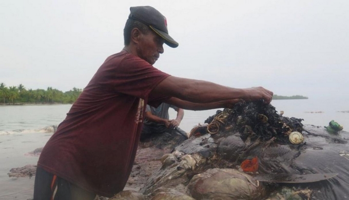 Una ballena fue hallada muerta por trabajadores del Parque Nacional de Wakatobi, en las aguas cerca a la isla de Kapota, Indonesia, al inspeccionar el cadáver descubrieron que este tenía una exorbitante cantidad de objetos de plástico en su estómago.