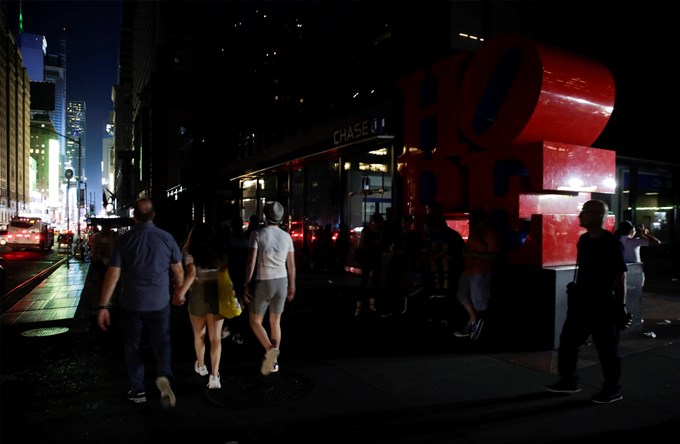 Decenas de personas fueron registradas este sábado al caminar por las calles del centro de Manhattan, durante un apagón en esta parte de Nueva York, EE.UU. EFE