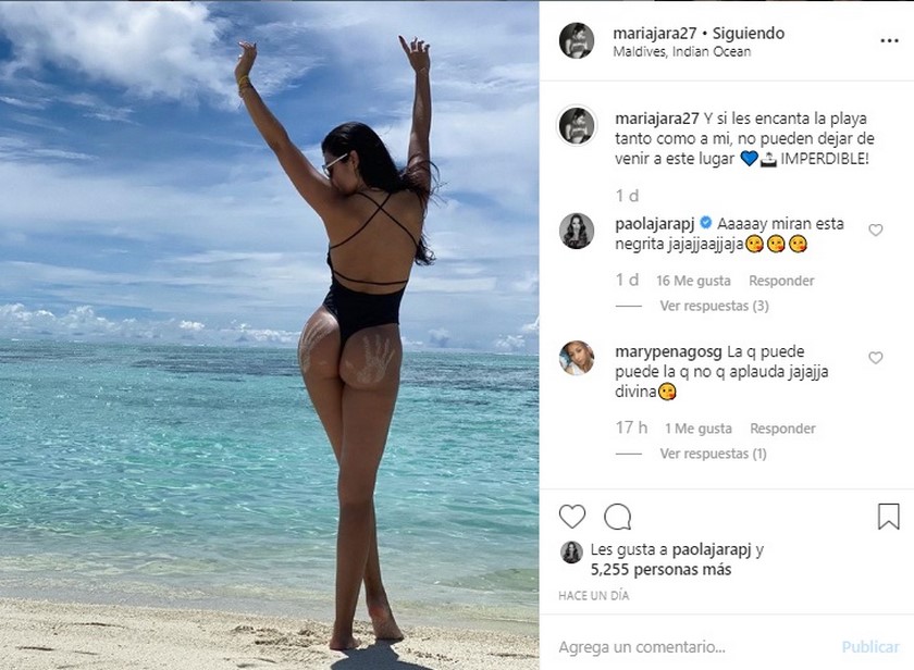 Pero lo que llamó la atención de sus seguidores en Instagram, fue la silueta de dos manos en arena que tenía en su trasero. Aunque María trata de tener una vida privada, hace días viene llamando la atención con sus atrevidas fotografías mientras disfruta de unas vacaciones con el que parece ser su pareja sentimental.