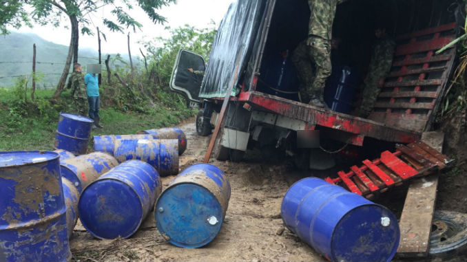 Allí se realiza la revisión del vehículo y se encuentran 48 canecas de 55 galones cada una con un tipo de ácido, usado para el procesamiento de estupefacientes.