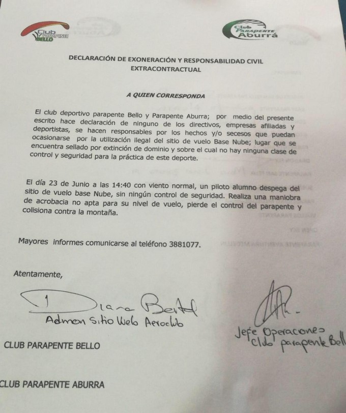 El club de parapentistas de Bello dio a conocer por medio de un comunicado que el joven despegó desde un lugar que no estaba autorizado para dicha actividad.