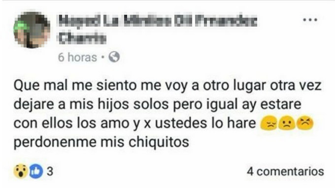 Según reportaron las autoridades, horas antes de tomar la decisión la fémina se despidió a través de las redes sociales, hasta le pidió perdón a sus dos hijos por dejarlos solos.