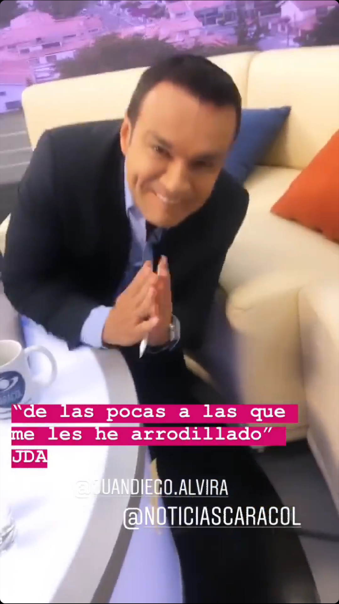 Todo quedó registrado en las historias de la presentadora de Caracol Mónica Jaramillo, quien fue la que mostró que su compañero de set, Juan Diego Alvira, arrodillado y hasta “pidiendo disculpas”.