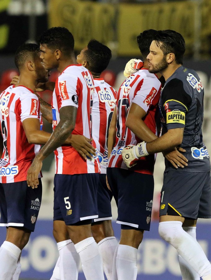 Los jugadores de Atlético Junior celebran tras un partido de la Copa Libertadores ante Guaraní de Paraguay en el estadio Defensores del Chaco de Asunción (Paraguay). EFE/Andrés Cristaldo